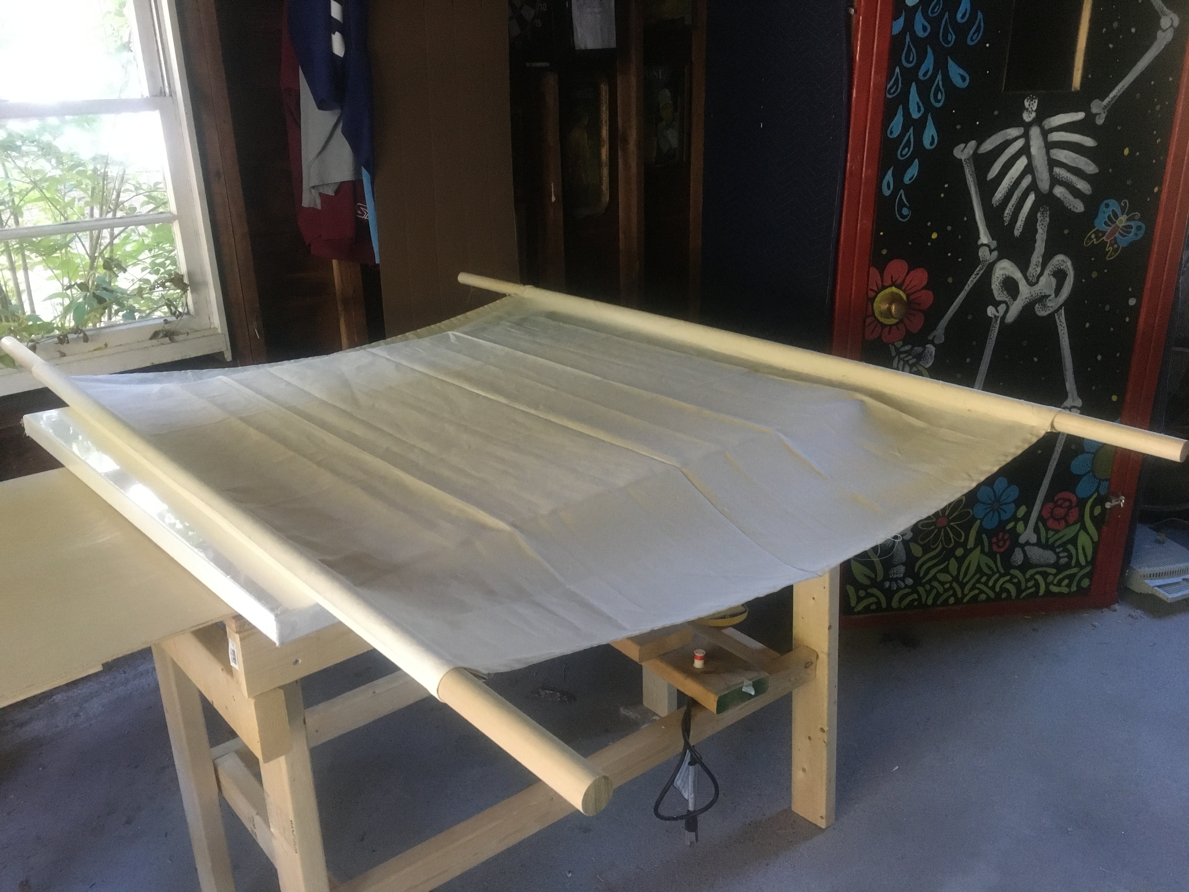 I started with rolled canvas that I measured to the appropriate length. I had the edges folded back on itself and used a sewing machine to seam every edge for durability. Then the top and bottom needed to be folded and sewn again for the slip holes for the wooden dowels that the canvas will hang from (pictured below).